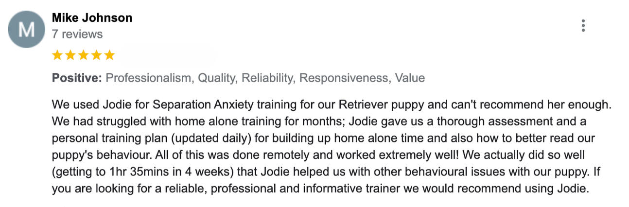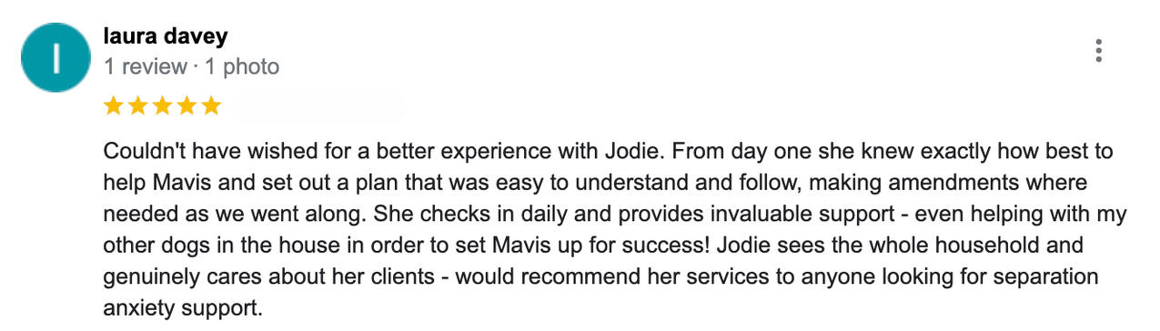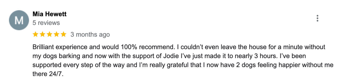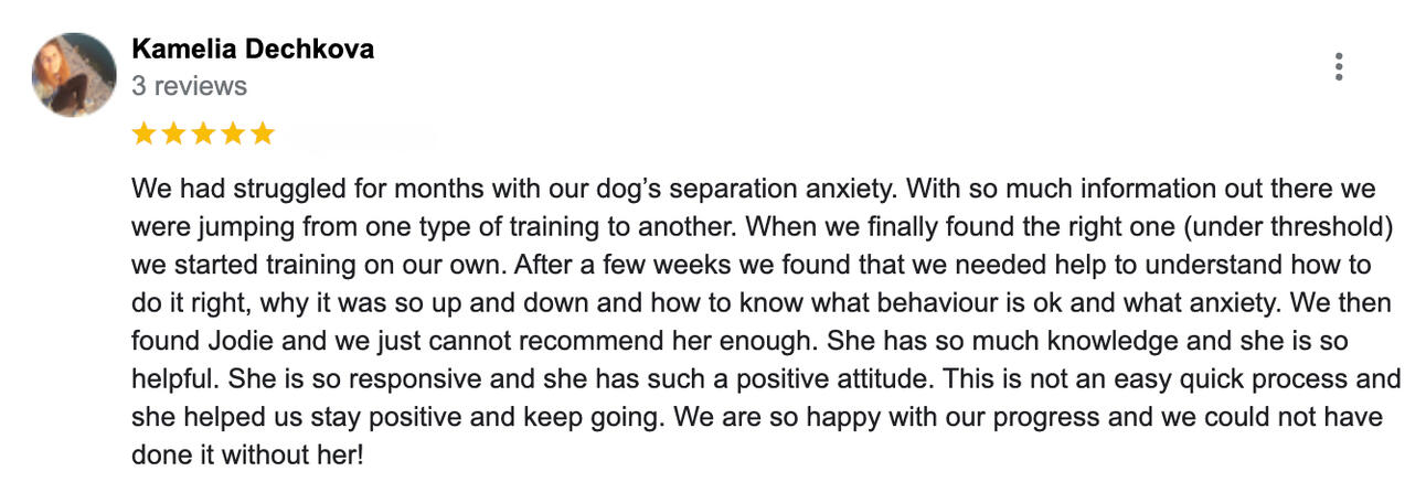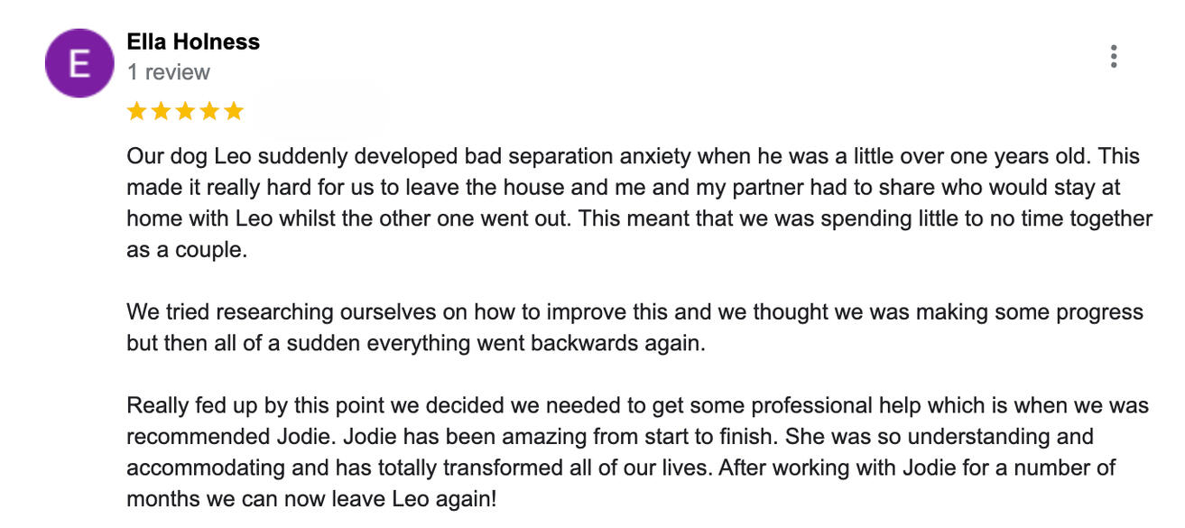 I’ve helped over 500 dog owners who thought they’d tried everything.I’ve seen every case, from dogs who howl the minute the door closes to dogs who tear the house apart and I’ve guided them to being calm, happy and safe when left alone.